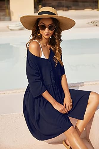 【Vogue Design】Bikini cowl up gown options deep V neck; quick sleeve; above knee size; pleated entrance, cute and claasic; button down diesign, straightforward to placed on or take off, you may have two look; excessive slicing, however can can completely cowl up your hip.