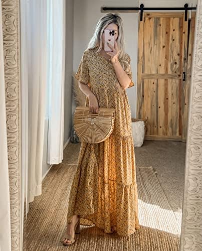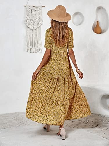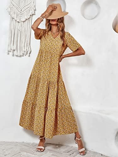 CFLONGE Ladies’s Summer season Brief Sleeve V Neck Floral Print Tiered Maxi Gown Excessive Waist Boho Flowy Lengthy Gown