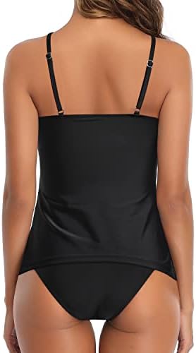 Tummy management tankini two piece swimsuits: The black tankini swimsuit for girls with ruched element supplies nice tummy management impact, making you look slim and displaying charming curves.