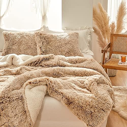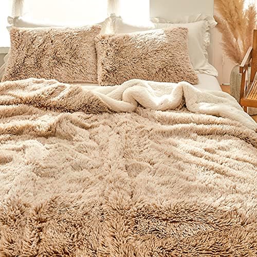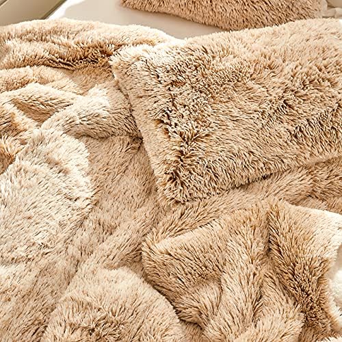 Joyreap 3-Piece Plush Shaggy Comforter Set Queen, Luxurious Fake Fur Velvet Fluffy Bedding Set for All Season (Khaki n White, 88×88 inches)