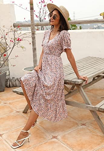 2. Options: Wrap V-Neckline Finish With A Security Button, Pleated Flowy Swing Hem Combines With Boho Floral Print, Elastic In Waist, Quick Flounce Sleeves, Summer season Ruffle Boho Midi Attire With Lining.