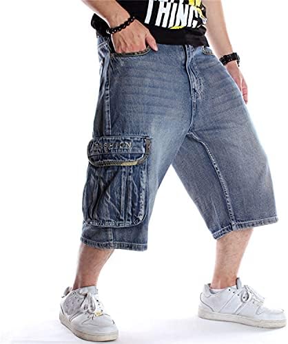 Males’s Cargo Pockets Denim Saggy Brief Hip Hop Facet Pocket Jean Shorts Moto Unfastened Washed Beneath Knee Shorts (Blue,46)