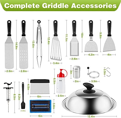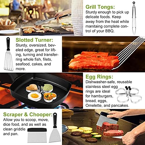 【Obligatory Griddle Equipment Equipment】Any critical griddle chef wants spatulas, scraper, and oil bottles to cook dinner scrumptious meals. The lengthy spatula can flip and transfer massive quantities of meals rapidly and precisely. Chopper/Scraper to cube meals and scrape griddles clear. The bevel turners/tapered spatula will deal with your dicing wants and grill cleansing.