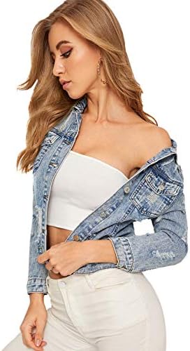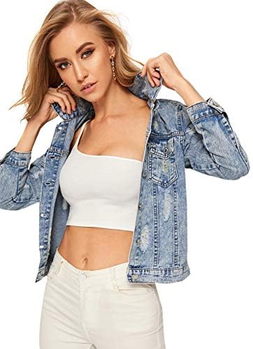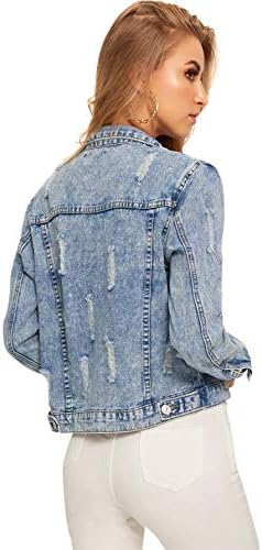 Romwe Ladies’s Informal Lengthy Sleeve Pockets Washed Distressed Denim Jean Jacket