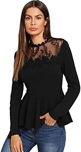 Romwe Ladies’s Lace Mesh Spherical Neck Pleated Elegant Slim Match Peplum Prime Shirt Shirt