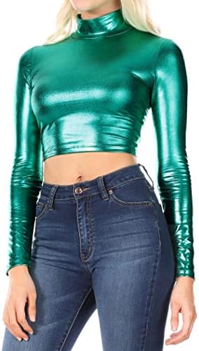 Sakkas Metallic Liquid Mock Neck Turtleneck Lengthy Sleeve Crop High – Made in USA