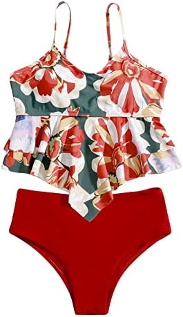 Girls Attractive Halter Swimsuit Set Tummy Management Bikini for Girl Two Piece Bathing Fits Flower Print Tank Excessive Waisted Triangle (Crimson, XL)