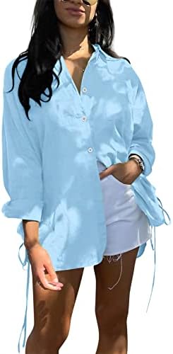 Womens Outsized Button Down Shirts Informal Lengthy Sleeve Cotton Linen Shirt Collared Boyfriend Tops