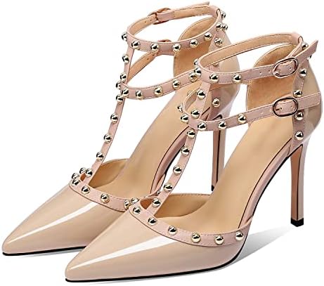 XINIUNIU Ladies Excessive Heel Sandals with Studded Rivets T-strappy Closed Toe Stilettos Pumps Pointy Toe Metallic Heels Celebration Dressing Footwear